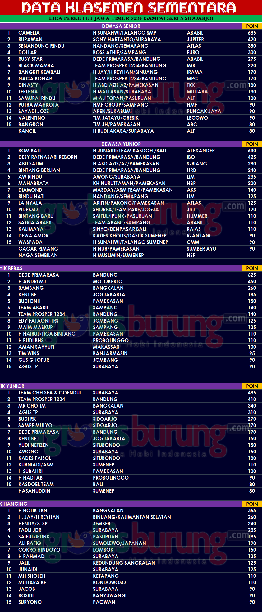 Sementara itu sampai penghitungan poin di LP. Jatim Sidoarjo para penghuni klasemen sementara LP. Jatim 2024 masih dihuni jawara jawara terbaik, Di Dewasa Senior, jawara Camelia (685) bergelang Ababil Milik H Sunahwi Talango Sumenep masih top up diposisi pertama, disusul jawara Rupawan (420) bergelang Jupiter dan Senandung Rindu bergelang Atlas diposisi kedua dan ketiga.