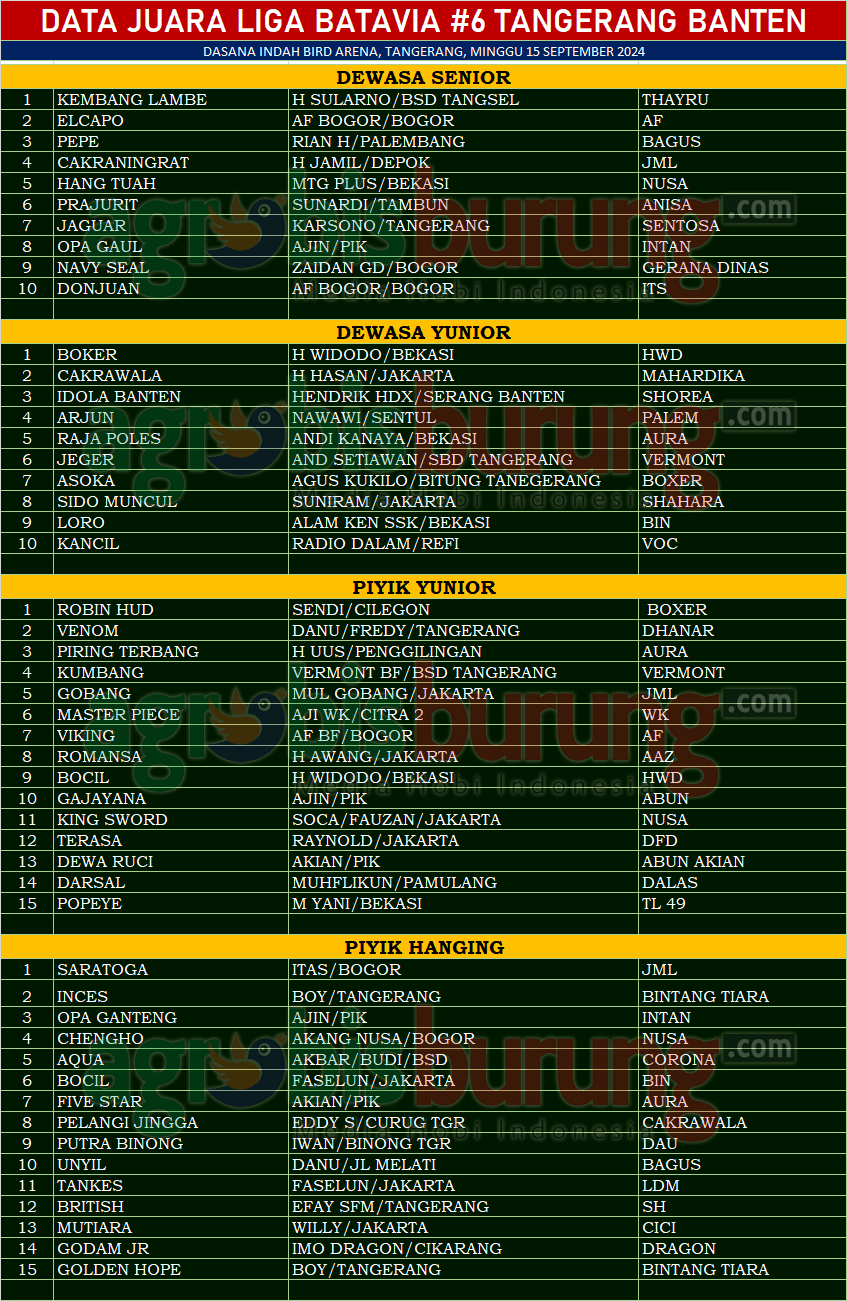 TANGERANG, agrobisburung.com – Gelaran Seri ke-6 Liga Batavia 2024 kembali digulirkan di wilayah Sejabodetabek dan kali ini tuan rumahnya adalah Tangerang Banten. Dan tentunya keseruan di Liga Batavia alias Sejabodetabek diserku kungmania di seputaran Serang, Jakarta, Bogor, Depok dan juga Bekasi. Dan doorpize pun juga menarik karena diundi burung burung berkelas dari peternak papan atas di Jabodetabek.