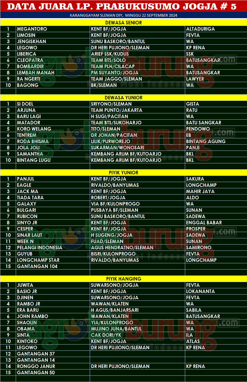 Data Juara LP. Prabukusumo Jogja # 5 di Sleman DIY, Minggu 22 September
