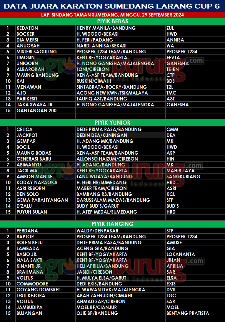 SUMEDANG, Agrobisburung.Com – Event keenam KSL Cup kali ini lebih spesial karena tidak hanya didominasi peserta dari wilayah Jawa Barat, tetapi juga hadir perwakilan dari luar kota seperti Jabodetabek, Yogyakarta bahkan Denpasar Bali. Kedaton (Henry Manila Bandung), Celica (Dede Prima Rasa Bandung) dan Perdana (Waldy Denpasar) menjadi yang terbaik di kelasnya masing-masing.