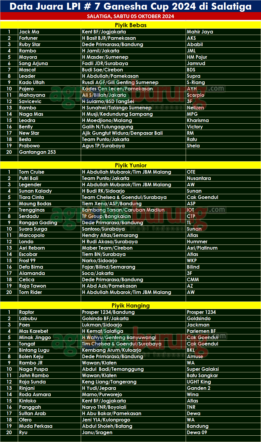 Data Juara LPI # 7 Ganesha Cup 2024 di Salatiga, Sabtu 05 Oktober (Kelas Piyik)