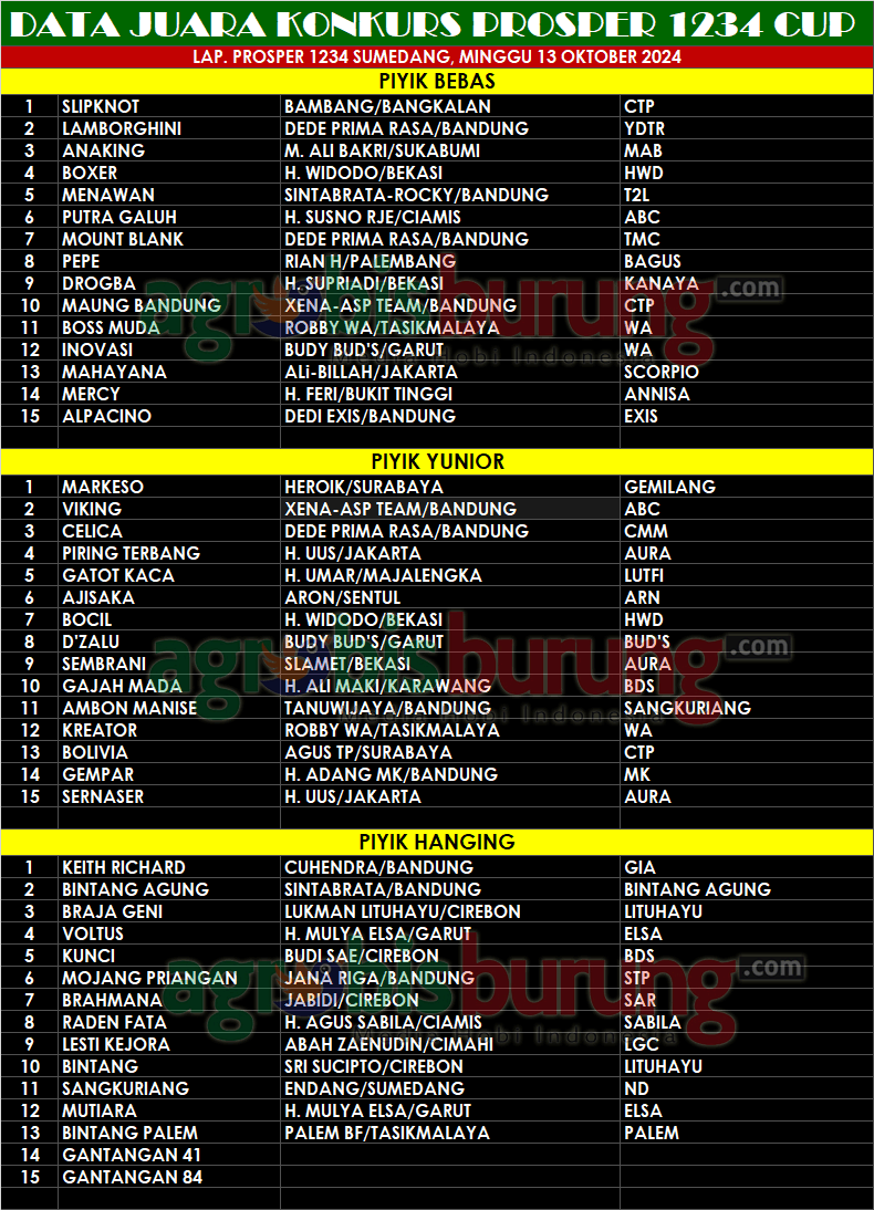 Data Juara Konkurs Regional Prosper 1234 Cup Sumedang, Minggu 13 Oktober 2024