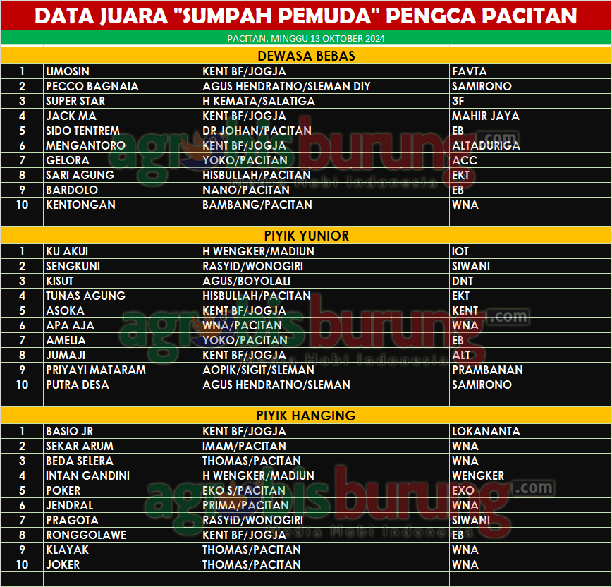 Setelah cukup lama tidak mengelar lomba, Pengca Pacitan dalam gelaran terbarunya Sumpah Pemuda Cup 2024 langsung membludak pesertanya. Bahkan kungmania dari berbagai kota seperti Solo, DIY, Madiun, Wonogiri juga ikutan hadir meramaikan gelaran gress pengda Pacitan dan beberapa tokoh penting perkutut di Pacitan DIY dan lainnya membuat suasana lombanya semakin berbobot.