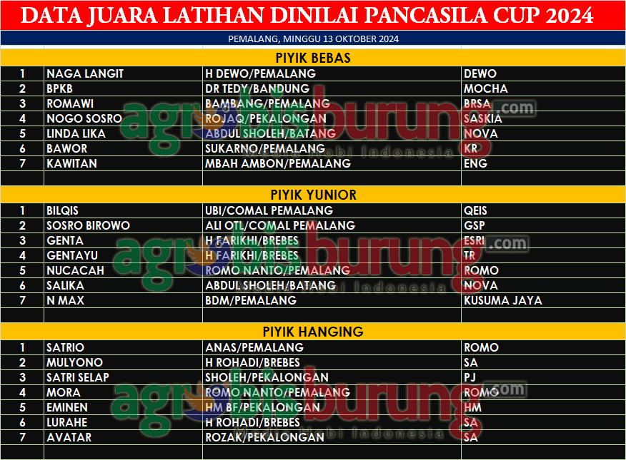 Sementrara hasil kejuaraan dari latihan dinilai Pancasila Cup 2024 di Pemalang, di piyik bebas Naga Langit bergelang Dewo milik H Dewo menjadi terbaik pertama di kelasnya. Jawara Bilqis bergelang Qeis milik Ubi Comal menjadi terbaik pertama di kelas piyik yunior dan di kelas hanging jawara terbaik pertama direbut Satrio bergelang Romo milik Anas Pemalang