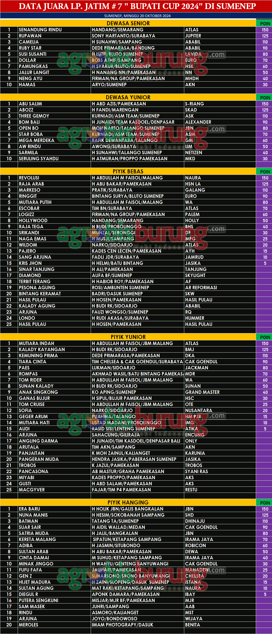 Data Juara LP. Jatim # 7 Bupati Cup 2024 di Sumenep, Minggu 20 Oktober