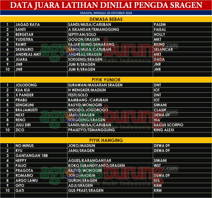 Di kelas piyik yunior jawara terbaik pertama diraih oleh Jolodong bergelabng DNT milik Surawan Masaran Sragen dan yang menjadi terbaik di kelas piyik hanging direbut oleh jawara No Minus bergelang Dewa 09 milik Joko Madiun.