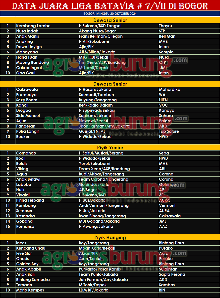 Dan di kelas piyik yunior yang menjadi terbaik pertama direbut jawara bernama Comando bergelang Seba dan dikelas piyik hanging debutan belia bernama Inces bergelang Bintang Tiara milik Boy Tangerang mengusai podium pertama di kelasnya.
