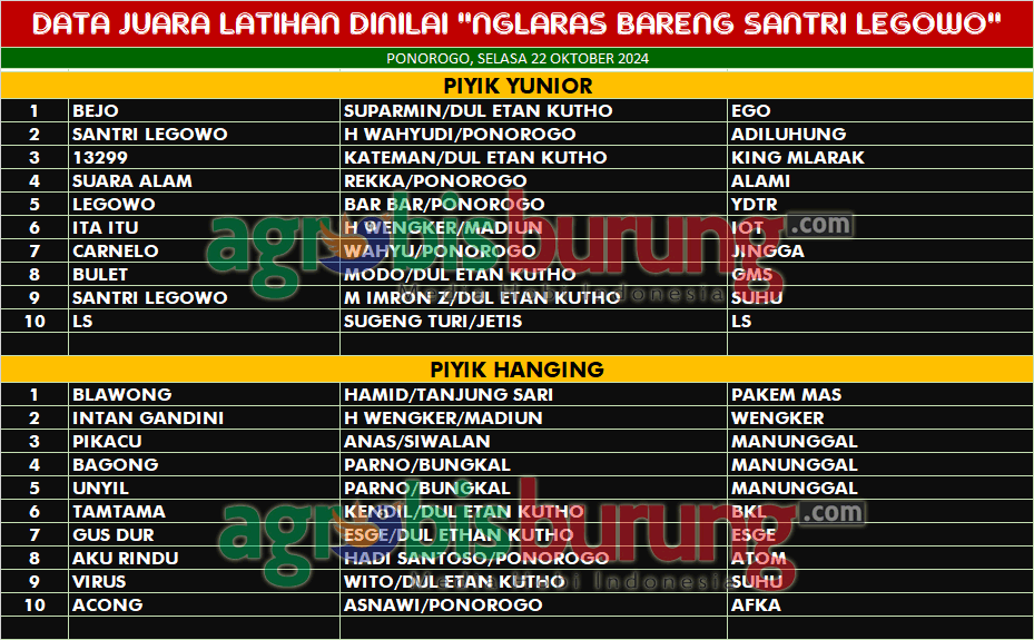 Di kelas piyik hanging, jawara Blawong bergelang Pakem Mas milik Hamid Tanjung sari menguasai permainan d kelasnya dengan merebut podium pertama dari lawan lawannya. Jawara Intan Gandini bergelang Wengker dan Pikacu bergelang Manunggal menyusul di podium kedua dan ketiga.