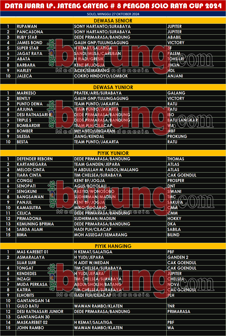 SOLO, agrobisburung.com –  Seri lanjutan LP. Jateng Gayeng ke-8  kembali digulirkan pada Minggu (27/10) di Solo yang bertajuk Pengda Solo Raya Cup 2024 dan gelaran ini diserbu kungmania dari Jateng plus beberapa team dari luar kota. Kungmania dari luar kota rata rata mereka memiliki jawara yang sudah masuk klasemen LP. Jateng Gayeng 2024 dan di seri ke-8 mereka tetap memburu poin untuk menentukan posisi terbaiknya. Dan ini data juaranya :
