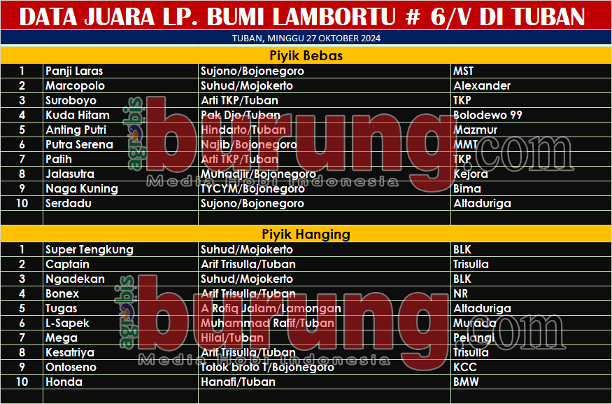 TUBAN, agrobisburung.com – LP. Lambortu 2024 menjadi moment penting penyelenggaranya (Pengda Lamongan,Bojonegoro & Tuban) sebab sampai pada seri ke-6 Lambortu di Tuban pada Minggu (27/10) semarak hobi perkutut khususnya di Lambortu sangat pesat berkembang. Murada, salah satu juri yang juga panitia Lambortu Tuban mengatakan bahwa dengan gelaran Lambortu yang sudah berjalan tahun ke-5 benar benar menghidupkan kembali hobi perkutut di seputaran Pantura. Saat ini kualitas dan kemampuan kungmania dalam breeding dan juga berlomba sudah tidak kalah dengan daerah lain, ada yang sudah mumpuni untuk melakukannya. “Terima kasih atas kehadirannya di Tuban untuk yang kesekian kalinya dan selamat kepada para pemenang seri Lambortu di Tuban,” ucap Murada mewakili segenap panitia.