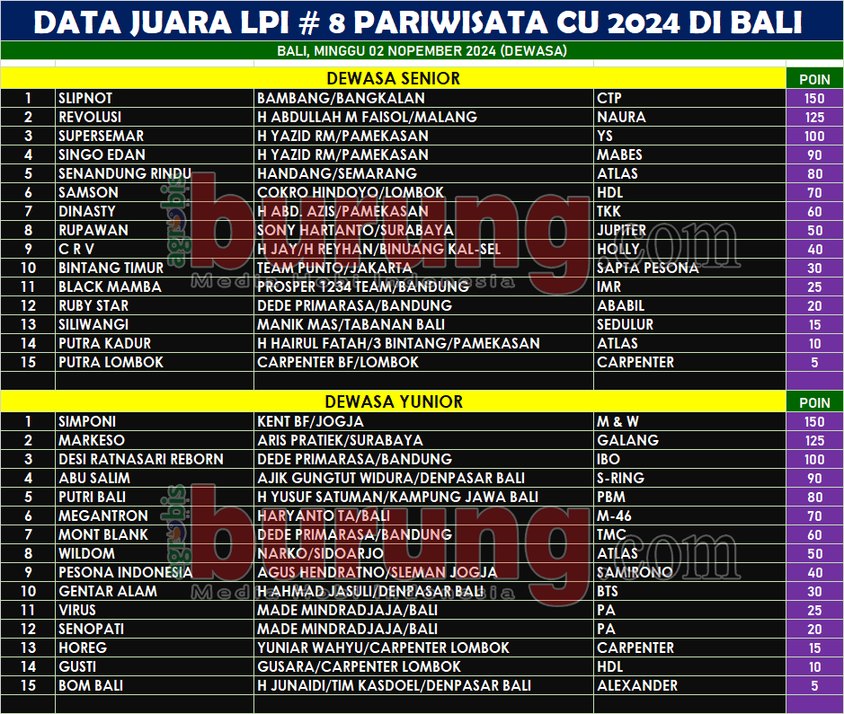 Data Juara LPI # 8 Pariwisata Cup 2024 di Bali, Minggu 03 Nopember (Kelas Dewasa)