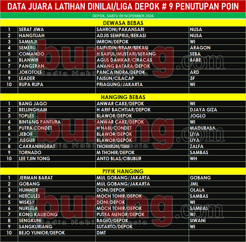 DEPOK, agrobisburung.com – Seri penutup latihan dinilai (Liga Depok) 2024 akhirnya dituntaskan di putaran ke-9 di markas WI BF Depok pada Sabtu (09/11) berjalan meriah dan dihadiri kungmania Depok dan sekitarnya. Heru WI koordinator latihan dinilai mengatakn bahwa sampai seri penutupan poin peningkatan pesertanya sangat luar biasa, kungmania pemula juga ikut terlibat sebagai peserta pendatang yang memberikan warna dalam perkembangan hobi perkutut di Depok dan sekitarnya.