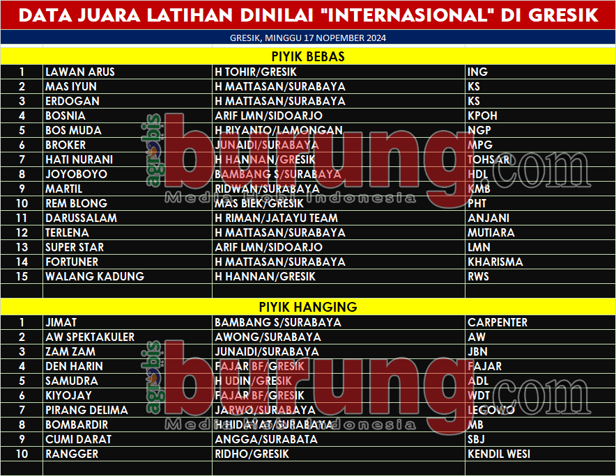 Sementara itu dari dua kelas yang dimainkan terlihat dua jawara terbaik adalah produk produk terbaik yang bakal melejit ke depannya, di piyik bebas, orbitan ING bernama Lawan Arus milik H Tohir PHT mulai menunjukkan taring dan bakal melesat prestasinya. Kemenangan Lawan Arus juga memantapkan kehebatannya untuk jadi salah satu indukan unggulan di PHT BF Gresik yang siap mencetak piyik berkualitas untuk dipantau dilapangan. Di susul diposisi kedua dan ketiga adalah yang direbut jawara milik H Mattasan Surabaya jawara Mas Iyun dan Erdogan yang sama sama bergelang KS.