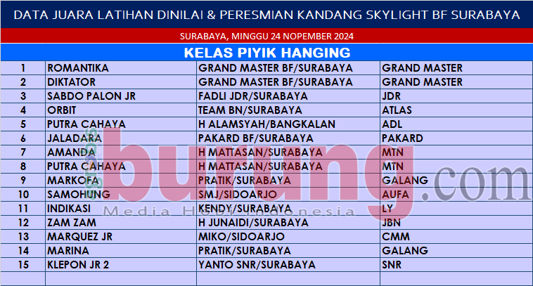 SURABAYA, agrobisburung.com – Memasuki hari tenang jelang Pilkada 2024, Ming Skylight menggelar latihan dinilai pada Minggu (24/11) yang sekaligus untuk syukuran kepindahan markas dan kandang baru Skylight BF Surabaya. Latihan dinilainya dilaksanakan sangat rileks karena hanya memainkan kelas piyik hanging dengan jumlah peserta hanya 60 saja. Ming Skylight mengatakan bahwa acara ini memang tidak banyak mengundang kungmania secara umum karena acara latihan dinilai yang 1 blok hanging dan juga dibarengi acara peresmian kepindahan di kandang baru Skylight BF dari markas lamanya.