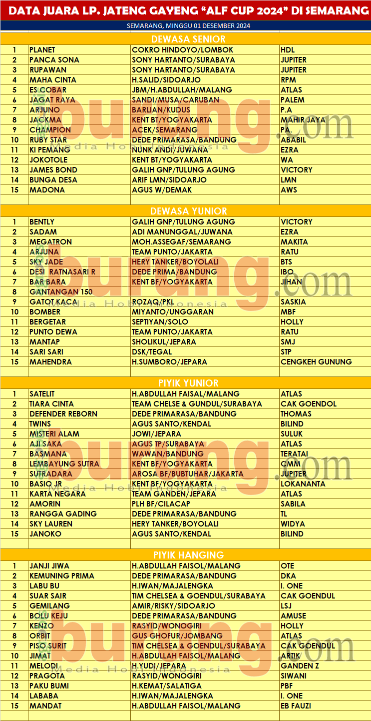 SEMARANG, agrobisburung.com – Gelaran LP Jateng 2024 seri akhir (Penutup) bertajuk ALF BF Cup pada Minggu (1/12) di lapangan Royal Family Marina Semarang berlangsung meriah. Seri penutupan ini juga dihadiri para pemburu poin yang menuntaskan perolehan poin di klasemen sementara untuk menjadi yang terbaik. HM Suprojo, ketua panitia yang juga ketua pengda Semarang menyampaikan ucapan terima kasih kepada kungmania Jateng yang hadir dan juga kawan kawan dari luar kota ynag sudah meluangkan waktu hadir di Semarang. “Terima kasih atas kehadiran kungmania Jateng dan luar Jateng yang hadir dan meramaikan seri penutupan LP. Jateng Gayeng 2024,” ucap HM Suprojo pada agrobisburung.com