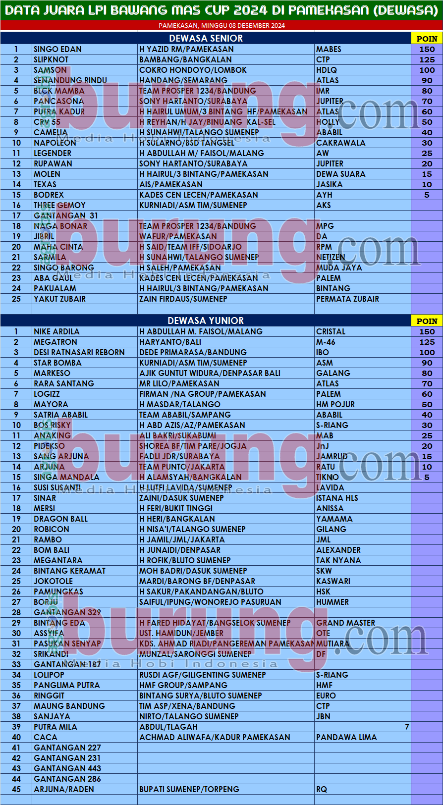 Sementara itu jalannya pertarungan di masing masing kelas terjadi banyak kejutan, burung burung terbaik LPI di Pamekasan yang menjadi salah satu daya tarik justru banyak yang tidak fight . Pasalnya setelan lomba yang biasanya cenderung untuk fight di cuaca panas justru membuta down grade peforamnya karena cuaca di Madura dalam sepekan memang lebih sering turun hujan. Di kelas dewasa senior, Jawara Singo Edan bergelang milik H Yazid RM Pamekasan tampil mengejutkan di depan burung burung terbaik saat ini. Jawara Slipknot bergelang CTP yang jadi lawan seterunya selama lomba memang SIngo Edan mampu menyudahi pertarungan dengan meraih podium pertama, Slipknot diposisi kedua dan Samson bergelang HDL diposisi ketiga.