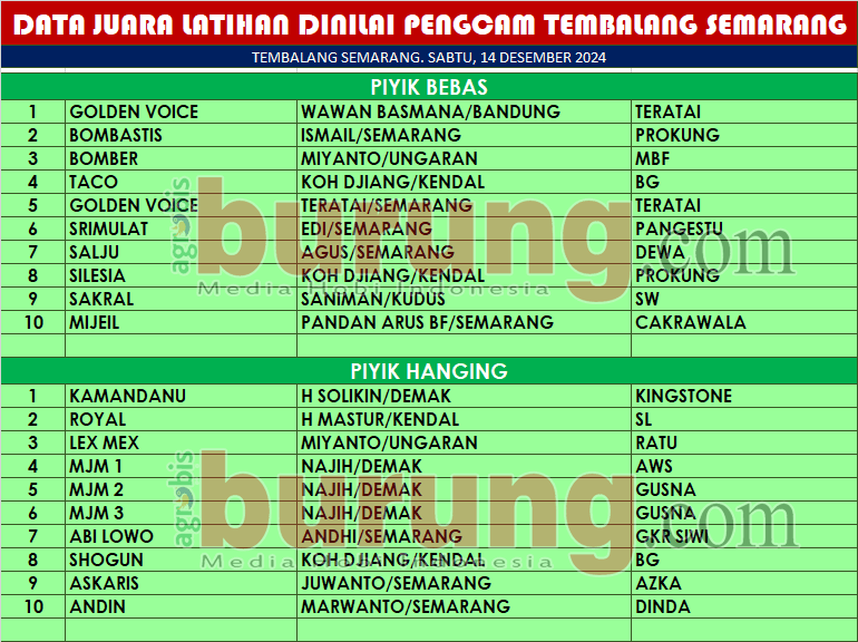Dan di kelas piyik hanging, debutan belia Kamandanu bergelang Kingstone milik H Solikin Demak tampil memukau di depan lawan lawannya, dengan kemampuan terbaiknya Kamandanu mampu merebut podium pertama. Disusul jawara Royal bergelang SL dan Lex Mex bergelang Ratu dipodium kedua dan ketiga.