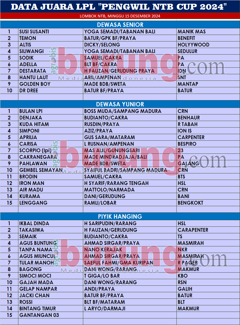 Di kelas piyik hanging yang menjadi juara terbaiknya adalah Ikbal Dinda bergelang HSK milik Sarifuddin asal Rang Rang NTB diposisi pertama dan disusu jawara Takasiwa bergelang Carpenter dan jawara Semaik bergelang TS diposisi kedua dan ketiga.
