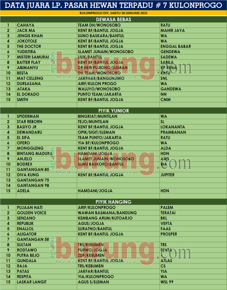 KULONPROGO DIY, agrobisburung.com – Agenda rutin LP. Pasar Hewan terpadu seri ke-7 kembali digulirkan di Lap. Pasar Hewan Terpadu Pengasih Kulonprogo pada Sabtu (18/01) yang diserbu kungmania dari berbagai daerah. Kehadiran kungmania dari Semarang, Ambarawa, Temanggung, Purworejo, Wonosobo, Cilacap, Solo, Sleman, Bantul, Jogja ikut meramaikan gelaran yang memang seru pelaksanannya. Dan dalam kesempatan tersebut juga dilantik ketua dan pengurus baru Pengda Kulonprogo oleh Ketua Pengwil DIY Susriyanta untuk tetap bersemangat menjalannkan oraganisasi P3SI pengda Kulonprogo.