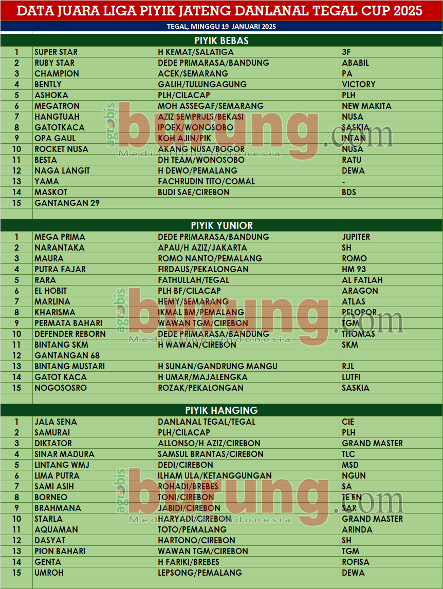 Sementara itu hasil dari pertarungan sengit di masing masing kelas menampilkan jawara jawara terbaik di kelasnya, di piyik bebas, jawara muda Super Star bergelang 3F milik H Kemat Salatiga menjadi terbaik pertama setelah mampu melewati rintangan lawan lawannya. Ruby Star bergelang Ababil dan Champion bergelang PA yang sempat menghadang lajunya harus terpental menempati posisi kedua dan ketiga.