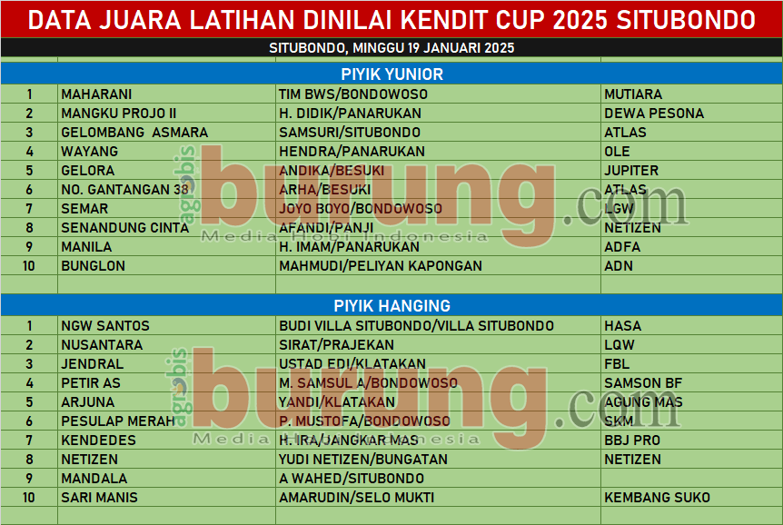 Sementara jalannya gelaran latihan dinilai yang memainkan dua kelas ini menampilkan jawara jawara muda baru yang langsung tampil gemilang, di kelas piyik yunior jawara Maharani bergelang Mutiara milik Tm BWS Bondowoso tampil prima di kelasnya dan mampu menguasai podium pertama. Mangku Projo II bergelang Dewa Pesona dan Gelombang Asmara bergelang Atlas menyusul menempati podium kedua dan ketiga