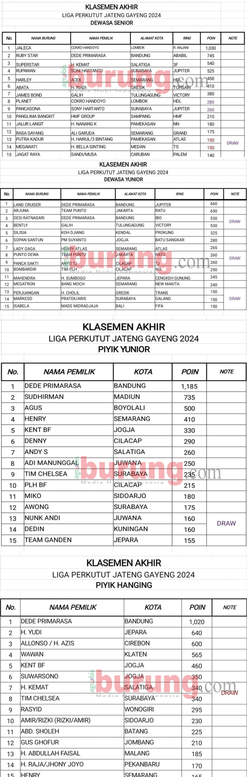 Dipemberian award kali ini menjadi terbaik pertama di dewasa senior direbut jawara Jaleca bergelang R Anjani milik Cokro Hindoyo Lombok NTB. Dan data lengkapnya peraih burung terbaik di masing masing kelas bisa melihat grafik data klasemen akhirnya.