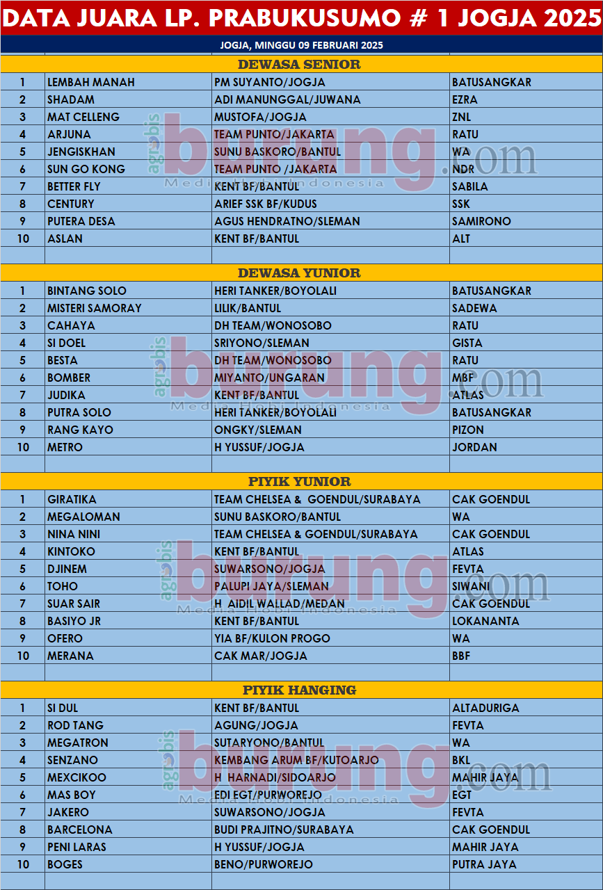 JOGJA, agrobisburung.com –  Gelaran Liga Perkutut (LP) Prabukusumo Jogja 2025 kembali digulirkan pada Minggu (09/02) di lapangan “lawas” Karanggayang Slemen DIY berlangsung meriah dan seru. Antonius Suhartono, ketua LPPJ 2025 menyampaikan bahwa seri LPPJ yang dari tahun ke tahun selalu sukses mendapat respon yang positif dari kungmania DIY, untuk itu di tahun 2025 LPPJ kembali digulirkan  dan dukungan kungmania di LPPJ tetap tinggi di pembukaan #1 LPPJ 2025. “Kami atas nama panitia mengucapkan terima kasih kepada kungmania DIY dan kungmania dari luar kota yang sudah meramaikan gelaran # 1 LPPJ 2025 di Sleman DIY, ” ucap Antonius Suhartono.