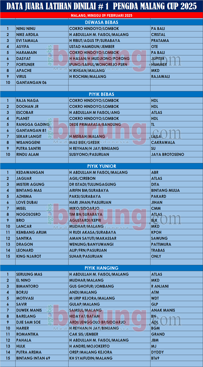MALANG, agrobisburung.com – Gelaran perdana latihan dinilai # 1 Pengda Malang Cup 2025 pada Minggu (09/02) berjalan seru dan sukses, persiapan panitia yang cukup matang selama sebulan terakhir memang membuat semua kuato kelas terpenuhi. Andi ATM. ketua pengda Malang mengatakan bahwa pembukaan latihan Dinilai # 1 Pengda Malang Cup akan digelara rutin selama setahun dan tiket yang dipatok panitia untuk pedafataran adalah Rp. 100 rb. Dengan tiket terjangkau diharapkan seri seri Latihan Dinilai Pengda Malang akan selalu ramai dan menarik. “Terima kasih kepada kungmania dari Malang dan juga luar kota seperti Surabaya, Sidoarjo, Mojokerto, Jombang, Kediri, Tulungagung, Blitar atas partisipasinya hadir di Malang. Dan selamat kepada para pemenang yang sudah masuk dalam dafra kejuaraan, ucap Andi Mintoko, ketua Pengda Malang Raya.