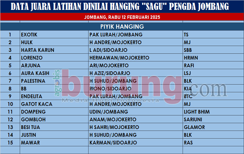 Sementara itu jalannya latihan yang memainkan kelas piyik hanging dengan iuran latihan senilai rp. 25 ribu tetap berbobot kualitas burung burung yang tampil, di kelas piyik hanging debutan belia bernama Exotic bergelang TS milik Pak Lurah asal Jombang tampil mengejutkan merebut podium pertama. Exotic mampu meredam tekanan dari HUlk bergelang MJ dan Harta Karun bergelang SBB yang akhirnya harus puas berada di podium kedua dan ketiga.