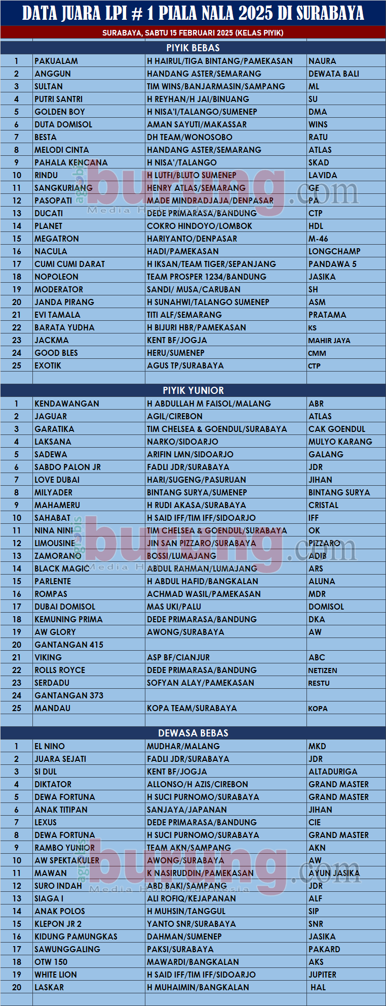 Data Juara LPI # 1 Piala Nala 2025 Di Bumi Marinir Karangpilang Surabaya, Sabtu 15 Februari