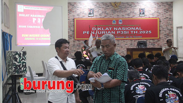SURABAYA, agrobisburung.com – Masih tetap semangat pagi , siang hingga malam …..Yel Yel Peserta Diklat Penjurian P3SI terus disuarakan …. Juri P3SI Hu …Ha…Hu…Ha …Juri P3SI … Tegas & Amanah … Juri P3SI … Bisa … Bisa … Pasti Bisa … Juri P3SI … Yes Yes Yessss . Semua sesi berjalan sesuai jadwal di sesi Jumat siang setelah sholat Jumat, ketua umum P3SI , Mayjen TNI (Purn) H Zainuri Hasyim dan pengurus, Ketua Diklat Penjurian P3SI 2025, Laksda TNI (Purn) B Ken Tri Basuki dan segenap panitia mengisi sesi penting tentang tujuan dan maksud gelaran Diklat Nasional Penjurian. Dan dokumentasi kegiatan Diklat hari kedua bisa dilihat