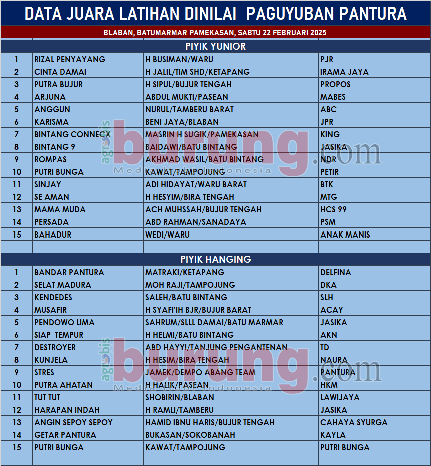 Gelaran kolom/latihan dinilai Paguyuban Pantura 2025 pada Sabtu (22/02) di Blaban, Batumarmar Pamekasan berjalan meriah dan penuh semangat. H Helmi, ketua panitia yang juga salah satu tokoh perkutut di Pantura menyampaikan ucapan terima kasih kepada Kades Blaban yang juga terpilih sebagai Wakil Bupati Pamekasan H. Sukrianto atas kehadirannya, H Romli Jasika, Rudi Komandan dan juga terima kasih kru panitia serta kawan kawan kungmania di sekitar Pantura atas partisipasi dan kehadiran di Latihan/Kolom dinilai Paguyuban Pantura.