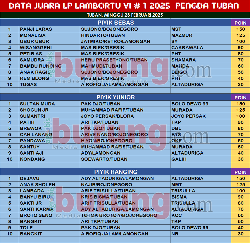 Sementara itu hasil dari liga yang menampilkan jawara jawara terbaik di wilayah Lambortu terlihat jawara jawara muda hasil breeding peternak di daerah tersebut unjuk kemampuan, di piyik bebas jawara handal Panji Laras bergelang MST milik Sujono asal Bojonegoro tampil perkasa dan merebut podium pertama setelah mampu mengalahkan lawan lawannya. Jawara Monalisa bergelang Mazmur dan Ubur Ubur bergelang SY yang dipenhujung liga tak bisa membendung laju Panji Laras akhirnya harus puas berada di podium kedua dan ketiga.