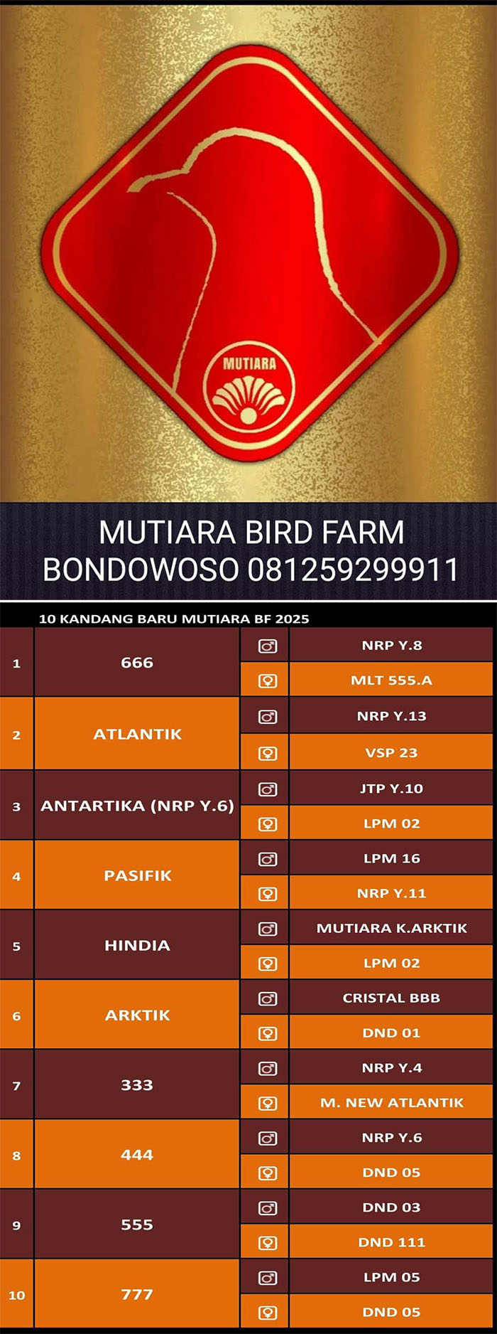 Akhir pekan lalu, Isen Mutiara merilis formasi kandang terbaru Mutiara BF Bondowoso. Sebanyak 10 pasangan indukan pilihan terbaik mengisi formasi kandang baru. Dari total 10 kandang tersebut, mayoritas bermaterikan trah import. Salah satu kandang bahkan pasangan indukan jawara, yakni kandang NRP Y.6 yang bermaterikan jantan JTP Y.10 dengan betina LPM 2. Pasangan ini adalah indukan Phet Yod Wi Hok (เพชรยอดวิหค) Champion ASEAN Yala & Runner-Up King Cup Narathiwat 2024.
