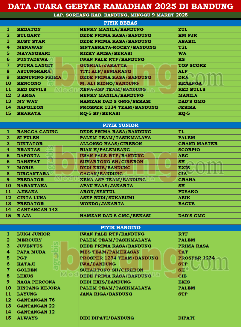 BANDUNG, agrobisburung.com – Agenda rutin bulan puasa bertajuk Gebyar Ramadan kembali digelar. Seperti tahun sebelumnya, hajatan Korps Juri P3SI Jabar kali ini digelar di lapangan P3SI Pengda Kab. Bandung, di Soreang, Minggu (9/3/25). Lomba berlangsung meriah meski dalam suasana puasa. Kungmania tetap semangat mengikuti gelaran. Bahkan, event kali ini juga semakin meriah dengan kehadiran tim tamu dari Jabodetabek.
