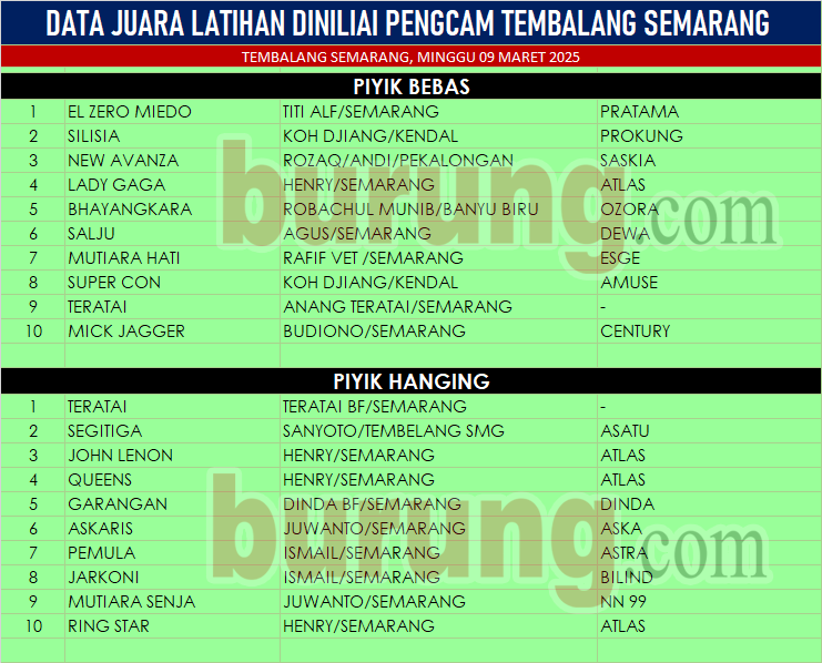 Dan di kelas piyik hanging, debutan belia Teratai milik Teraia BF Semarang kali ini bikin kejutan di kelasnya, tampil dominan sepanjang babak membuat Teratai meraih posisi pertama. Dan Segitiga bergelang Asatu dan John Lenon begrelang Atlas menempati posisi kedua dan ketiga.