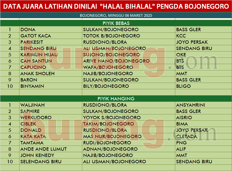 Gelaran latihan Dinilai Pengda Bojonegoro bertajuk Halal Bihalal benar benar menjadi ajang “temu kangen” setelah libur Ramadhan selama sebulan penuh dan di hari yang penuh kesucian kungmania yng hadir di acara tersebut benar berna terlihat ceria. Arive Nano, ketua pengda Bojonegoro menyampaikan bahwa di hari yang penuh kebahagian di Lebaran 1 Syawal 1446 H kita semua berkumpul untuk ngerek burung perkutut  di gelaran penuh kekeluargaan dan saling bermaafan karena masih dalam suara Idul Fitri.