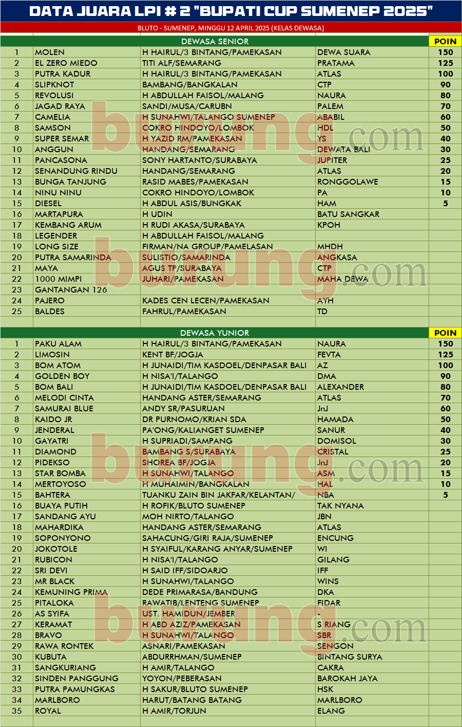Data Juara LPI # 2 Bupati Cup 2025 di Sumenep, Minggu 13 April (Kelas Dewasa)