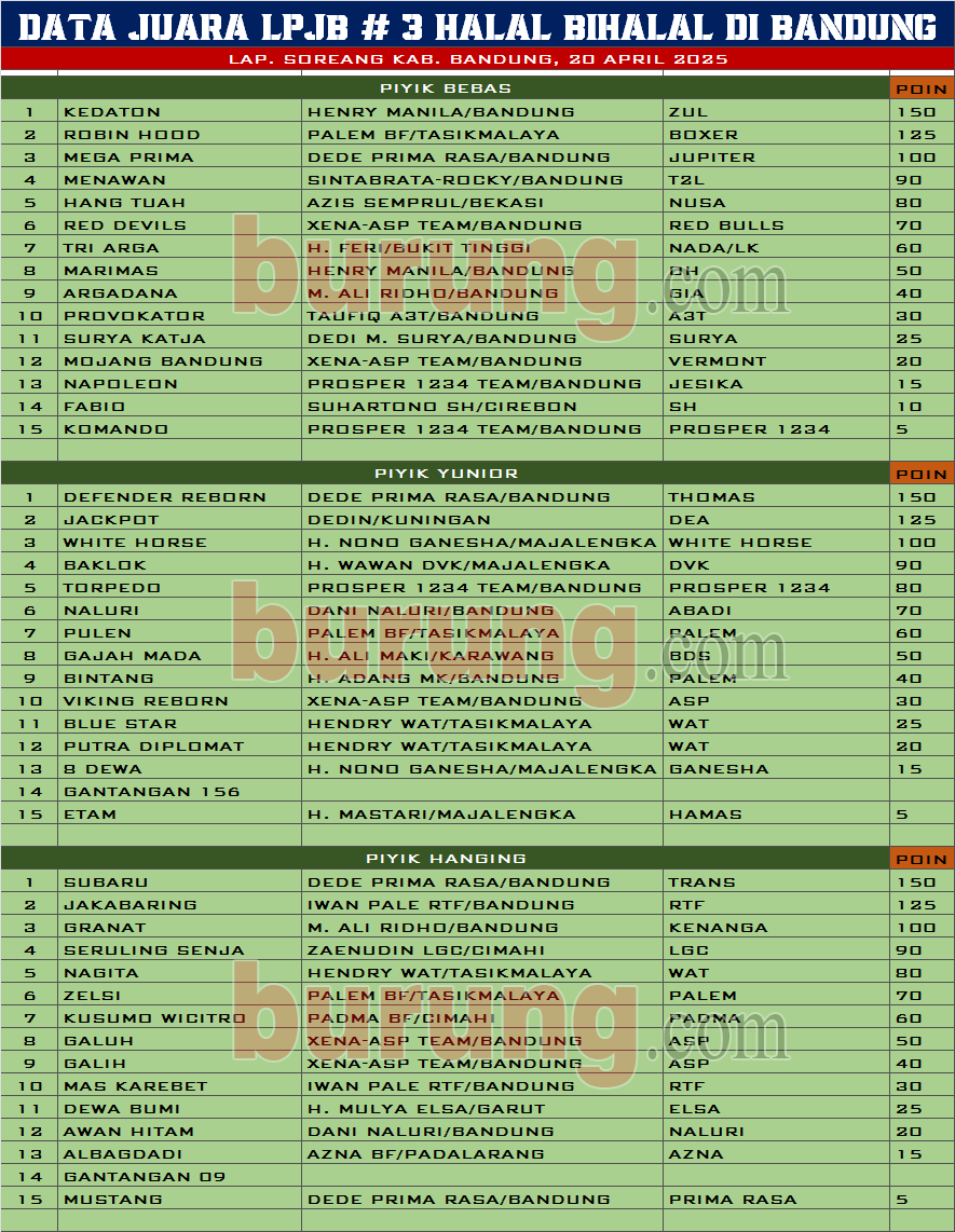 Kali ini Prima Rasa Team Bandung yang dikawal langsung Panglima BK didampingi Roy Fajri dan Wawan Morsen, kembali sukses mencatatkan prestasi gemilang. Tim yang dinakhodai Dede Prima Rasa ini berhasil mencetak Double Winners, meraih juara 1 didua kelss. Defender Reborn (Thomas) yang sedang disiapkan ke LPI #3 Semarang berhasil meraih juara 1 piyik yunior. Kemudian, Subaru (Trans) andalan anyar di kelas piyik hanging juga berhasil meraih juara 1. Sedangkan, andalan lainnya Mega Prima (Jupiter) meraih juara 3 piyik bebas dan Mustang (Prima Rasa) meraih juara 15 hanging.