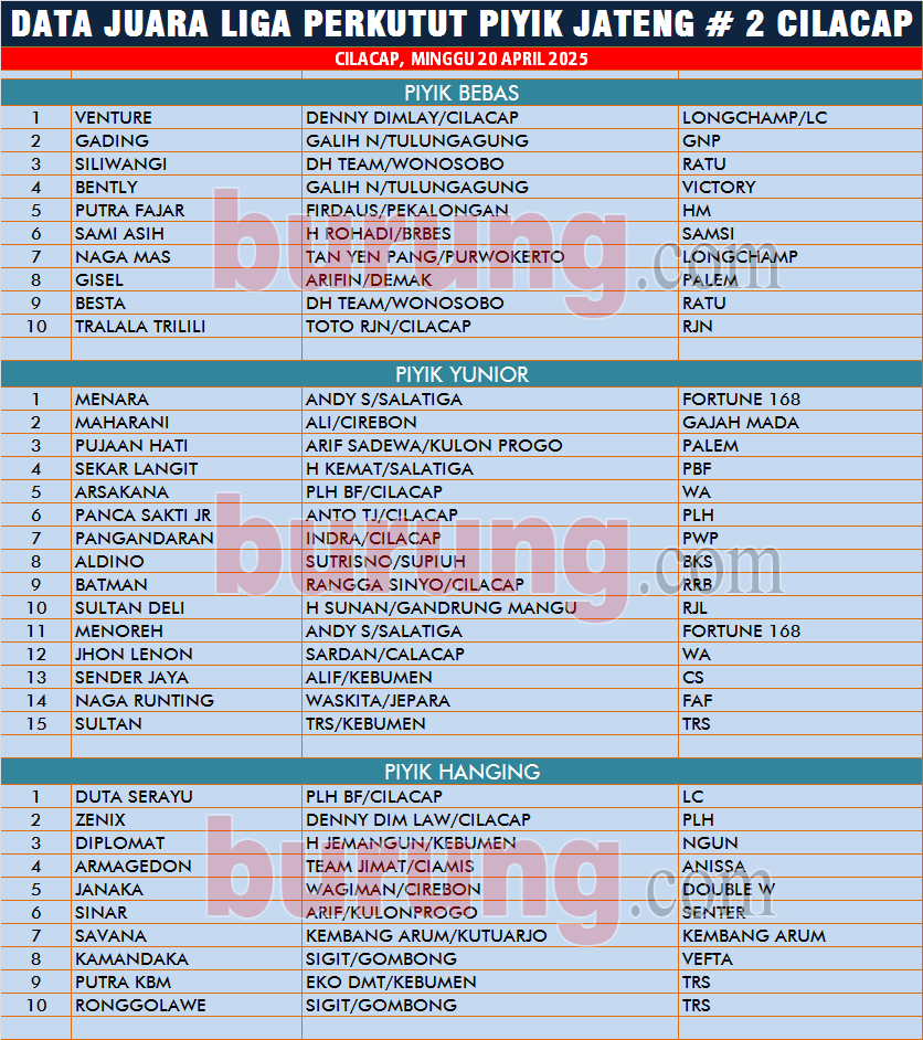 Dan yang jadi kampium terbaik di kelas piyik hanging dikuasai jawara Duta Serayu bergelang LC milik PLH BF Cilacap yang benar benar memilik kualitas ciamik saat tampil di kelasnya. Tampilan ciamik jawara Duta Serayu mengantarkannya merebut posisi terbaik pertama, disusul Zenix bergelang PLH dan Diplomat bergelang Ngun yang menempai posisi kedua dan ketiga.