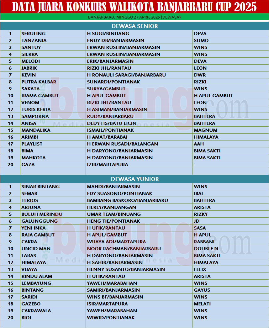Di dewasa yunior juga terjadi persaingan ketat, jawara Sinar Bintang bergelang Wins milik Mahdi Banjarmasin yang sejak star sudah bermain cantik mampu mempertahakan peforma terbaiknya hingga babak penentuan kejuaraan dan Sinar Bintang melejit ke podium pertama. Disusul dipodium kedua dan ketiga jawara Semar bergelang Ibal dan Terios bergelang Bahtera.