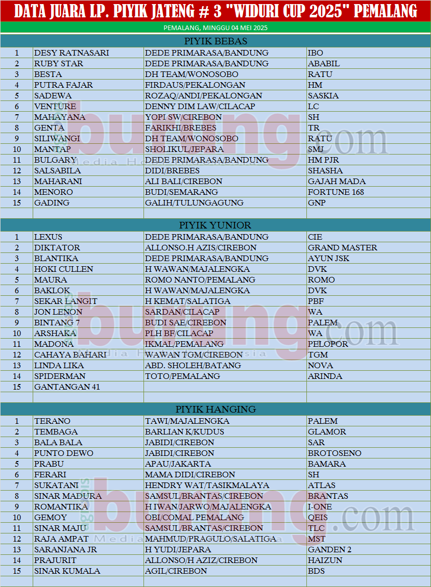 Dede Primarasa Bandung kuasai 2 kelas bersama Desy Ratnasari, Lexus & Terano terbaik di hanging LP Piyik Jateng Widuri Cup 2025 Pemalang