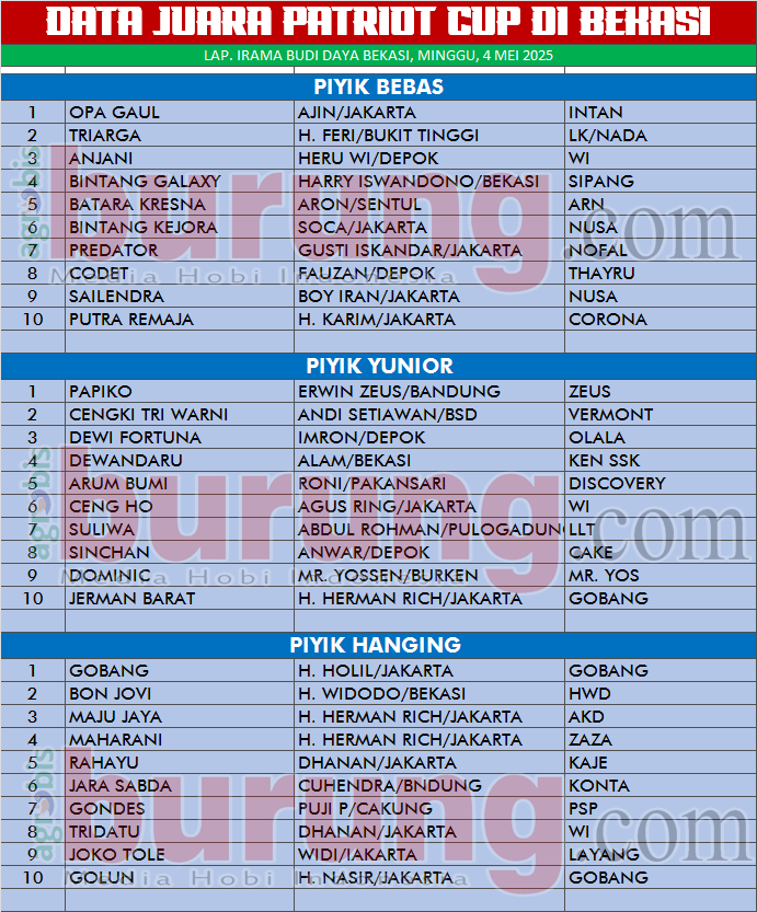 BEKASI, agrobisburung.com – Kali kedua event Patriot Cup digelar setelah tahun 2024 lalu event perdana sukses digelar. Event kebanggaan P3SI Pengda Bekasi ini memang diproyeksikan menjadi agenda tahunan. Bertempat di lapang Irama Budi Daya Bekasi, lomba setingkat regional kembali digelar, Minggu (4/5/25). Selain didominasi peserta dari seputar Jabodetabek, hadir pula peserta dari luar kota perwakilan dari Bandung dan Tasikmalaya. “Kita berharap Patriot Cup jadi ikon Kota Bekasi. Setelah dua kali digelar sukses, mudah-mudahan tahun depan bisa jadi event besar,” harap Aziz D’Semprul Melumase BF, ketua pelaksana.