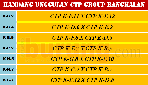Sebagaimana yang diharapkan RA Mahmud, setidaknya sebagai seorang breeder sejati orbitan CTP harus bisa naik podium nasional /LPI 1 -3 ekor dan itu akan menjadi pelecut seorang breeder sejati. Dan itu diwujudkan dengan hadirnya beberapa kandang unggulan CTP BF yang sudah banyak mencetak burung burung berkualias termasuk salah satunya SlipKnot, adapun kandang unggulan tersebut CTP K-B.2 (CTP K-F.11 X CTP K-F.12), CTP K-B.4 (CTP K-D6 X CTP K-E.2), CTP K-B.9 (CTP K-F.8 X CTP K-D.8), CTP K-C.2 (CTP K-F.7 X CTP K-B.5), CTP K-N.5 (CTP K-G.8 X CTP K-F.10), CTP K-N.7 (CTP K-C.2 X CTP K-B.7), CTP K-G.7 (CTP K-E12 X CTP K-D8). Kandang-kandang unggulan tersebut diatas, berisikan indukan-indukan yang sudah punya karakter kuat hasil pengamatan selama 4 tahun menjalankan teori breeding is the character, karena breeding tanpa sebuah karakter adalah flying without wings, we reach nothing … !!!