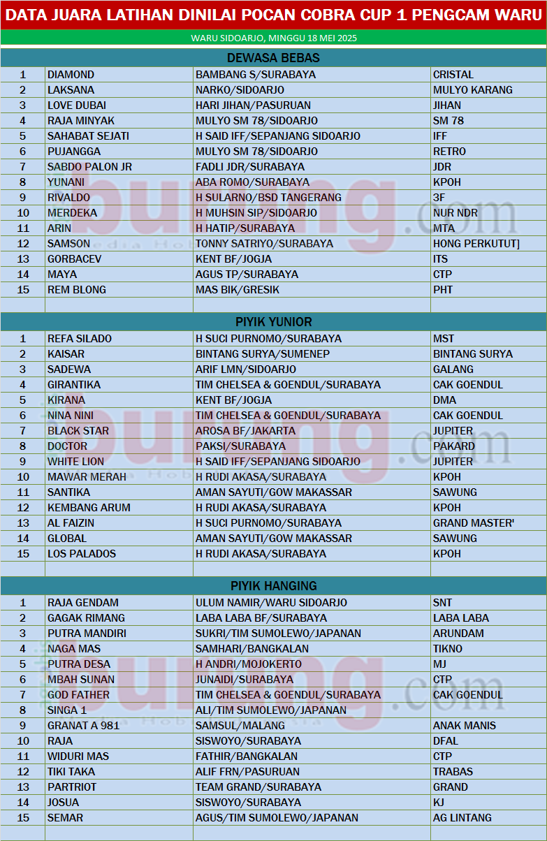 Di kelas dewasa bebas jawara Diamong bergelang Cristal milk Bambang S Surabaya kali ini menjadi yang terbaik pertama di kelasnya, dikelas piyik yunior jawara Refa Silado bergelang MST milik H Suci Purnomo melejit dipodium pertama . Dan di kelas piyik hanging jawara belia bernama Raja gendam bergelang SNT milik Ulum Namir Waru Sidoarjo moncer diposisi pertama, untuk data kejuaraan lengkapnya silahkan lihat data Kejuaraan.