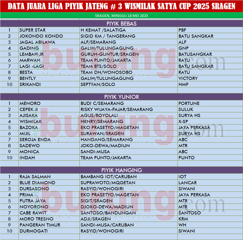 Gelaran Liga Piyik Jateng # 4 bertajuk Wismilak Satya Cup 2025 di Sragen pada Minggu (18/05) di Lap. Bojorejo Krang Malang Sragen benar benar menjadi wadah kungmania untuk mengekspesikan jago jago terbaiknya. Dan ini juga sesuai harapan H Kemat, ketua Pengwil Jateng bahwa untuk lebih menyemarakkan hobi merata dan mengoptimalkan hasil breeding peternak jateng di berbagai daerah maka solusinya adalah memainkan Liga Piyik yang dilaksanakan merata di semua pengda di Jateng. Andreas, ketua pengda Sragen mengatakan bahwa gelaran Wismilak Satya Cup 2025 adalah merupakan bagian daerah khsusnya pengda Sragen menyemarakkan hobi perkutut di Jawa Tengah dan melihat antusias kungmania yang hadir dari berbagai daerah seperti Semarang, Salatiga, Madiun, Solo dan Sragen sendiri nampaknya agenda tersebut akan dirutinkan.