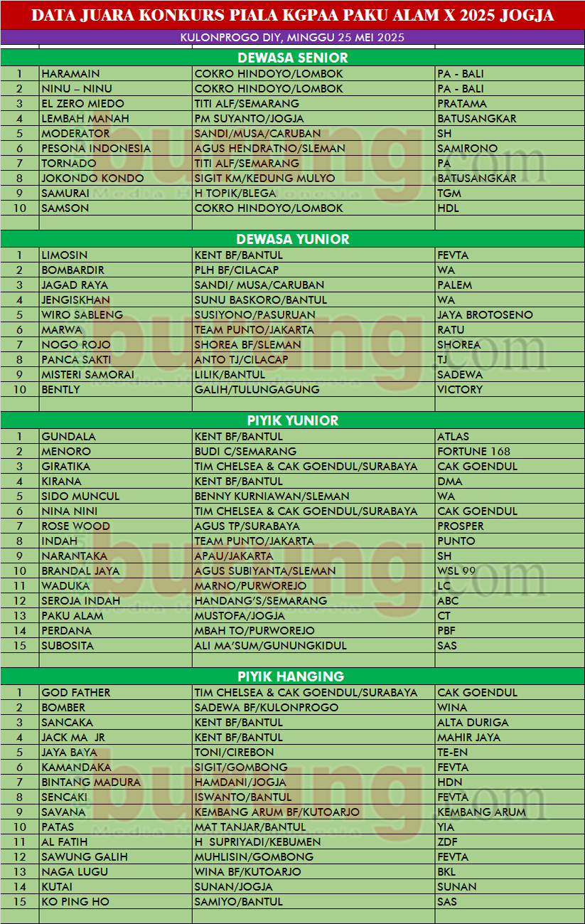 JOGJA, agrobisburung.com – Gelaran Konkurs Piala KGPAA Paku Alam X tahun 2025 kembali digelar pengwil DIY pada Minggu (25/05) yang dilaksanakan di Pengda Kulon Progo, DIY. Meskipun kali ini di gelar di daerah, namun tidak mengurangi sedikitpun antusias para kung mania untuk hadir melombakan jagoannya. Banyak peserta dari luar kota tampak hadir memadati seputaran arena konkurs. Sebagaimana tahun tahun sebelumnya , pada konkurs kali ini pun Pengwil DIY tetap berkolaborasi dengan Dinas Pariwisata DIY. Tampak suasana lain di event ini, karena tampak para pelaku Ekonomi Kreatif binaan Dinas Pariwisata DIY, hadir turut meramaikan suasana dengan berjejer rapi disekitar lapangan menjual hasil pruduksinya, mulai dari makanan, minuman hingga cindera mata.
