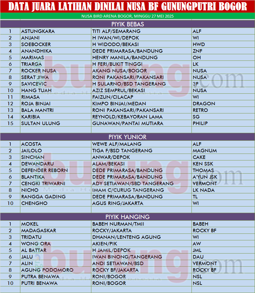 Dan di kelas piyik hanging, jawara Mokel bergelang Babeh milik Babeh Nurman masih tangguh di kelasnya untuk memenangi posisi pertama dari jawara Madagaskar bergelang Rocky dan Tridatu bergelang WI yang menempati posisi kedua dan ketiga.