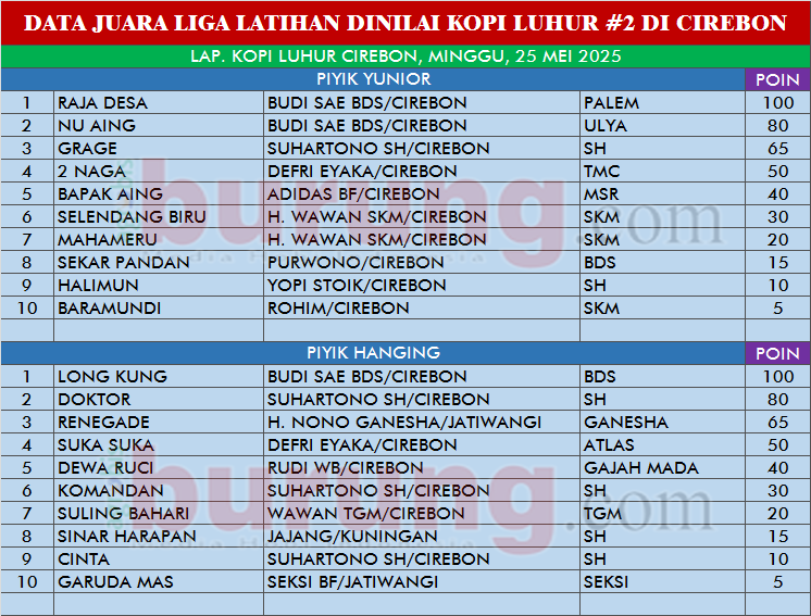 Lanjutan Liga Ladini Kopi Luhur yang melombakan 2 kelas piyik (yunior dan hanging) kembali digelar di lapangan kebanggaan Jawa Barat, Kopi Luhur, Jl. Cadas Ngampar Cirebon, Minggu (25/5/25). Putaran kedua kali ini sekaligus pemanasan menjelang digelarnya Liga Perkutut Jawa Barat (LPJB) putaran keempat, yang akan digelar pekan depan di lapangan P3SI pengda Majalengka, Jl. Olahraga Jatiwangi, Kab. Majalengka, Minggu, 1 Juni 2025.