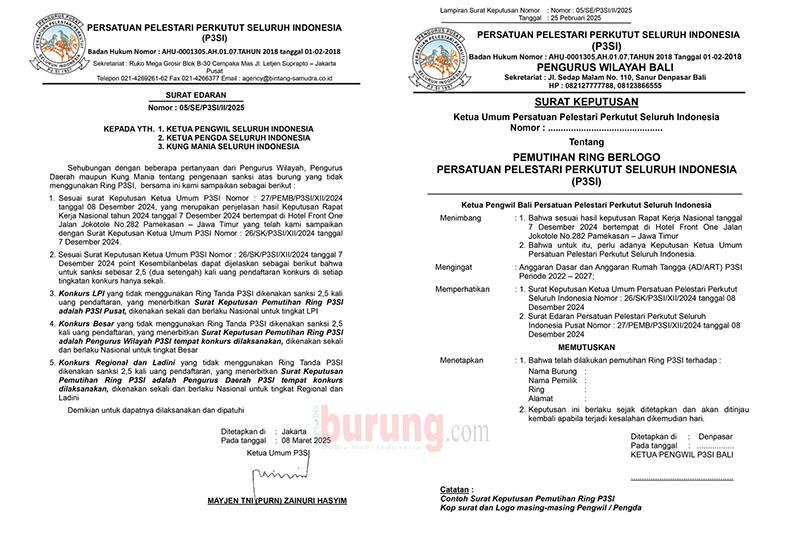 Surachman, sekjen P3SI juga mengingatkan bahwa semua program P3SI selalu disahkan dalam surat keputusan/surat edaran termasuk untuk Plakat dan juga Ring P3SI serta program lainnya. Pada SKEP 26/SK/P3SI/XII/2024 ditegaskan pada poin ke-18 & 19 bahwa dalam konkurs LPI (Liga Perkutut Indonesia) untuk burung impor yang ingin mengikuti konkurs LPI wajib melakukan “naturalisasi” dengan biaya Rp. 1 juta dan untuk burung lokal yang tidak menggunakan ring P3SI akan dikenakan sanksi “denda” sebesar 2,5 (dua koma lima) kali pendaftaran konkurs. Dan ini kembali ditegaskan pada surat edaran P3SI Nomor 05/SE/P3SI/2025 bahwa sanksi denda diterapkan dan dikenakan sekali dan berlaku nasional/besar/Regional – Latihan Dinilai untuk tingkat LPI/Besar/Reginal-Latihan Dinilai. Semua pelaksanaan sanksi ini akan disertakan SK surat Pemutihan yang akan diterbitkan sesuai tingkatan lomba yang diikutinya.